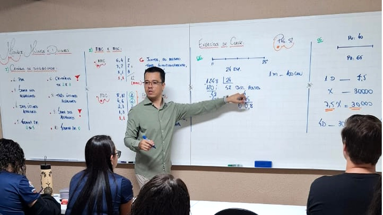 Foi uma aula prática, com resolução de exercícios, discussão de caminhos possíveis e foco em entender por que cada resposta faz sentido. Tudo isso em um ambiente de turmas reduzidas, com atenção real ao aluno e espaço para errar, perguntar e aprender. Nada de macetes milagrosos ou fórmulas decoradas.