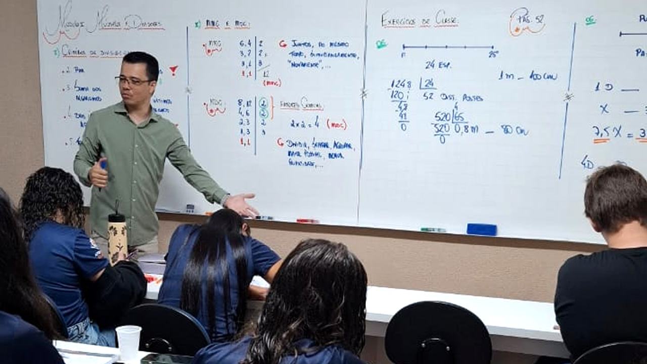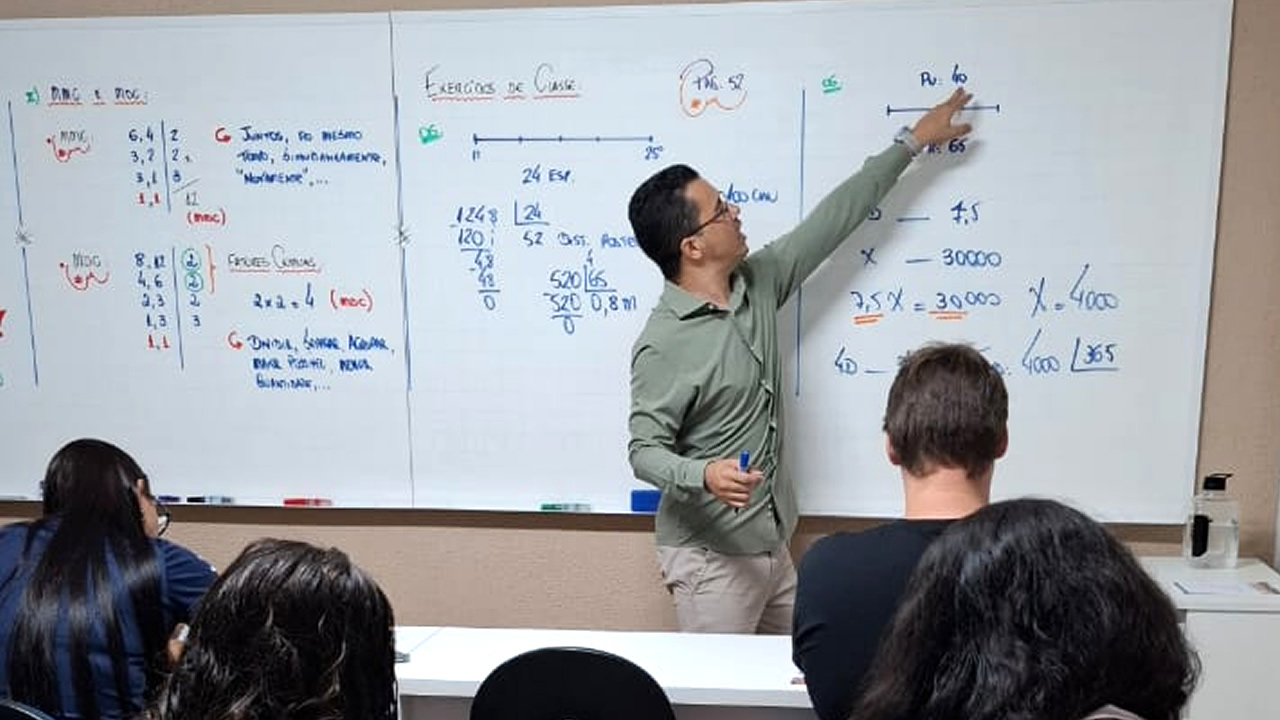 Foi uma aula prática, com resolução de exercícios, discussão de caminhos possíveis e foco em entender por que cada resposta faz sentido. Tudo isso em um ambiente de turmas reduzidas, com atenção real ao aluno e espaço para errar, perguntar e aprender. Nada de macetes milagrosos ou fórmulas decoradas.